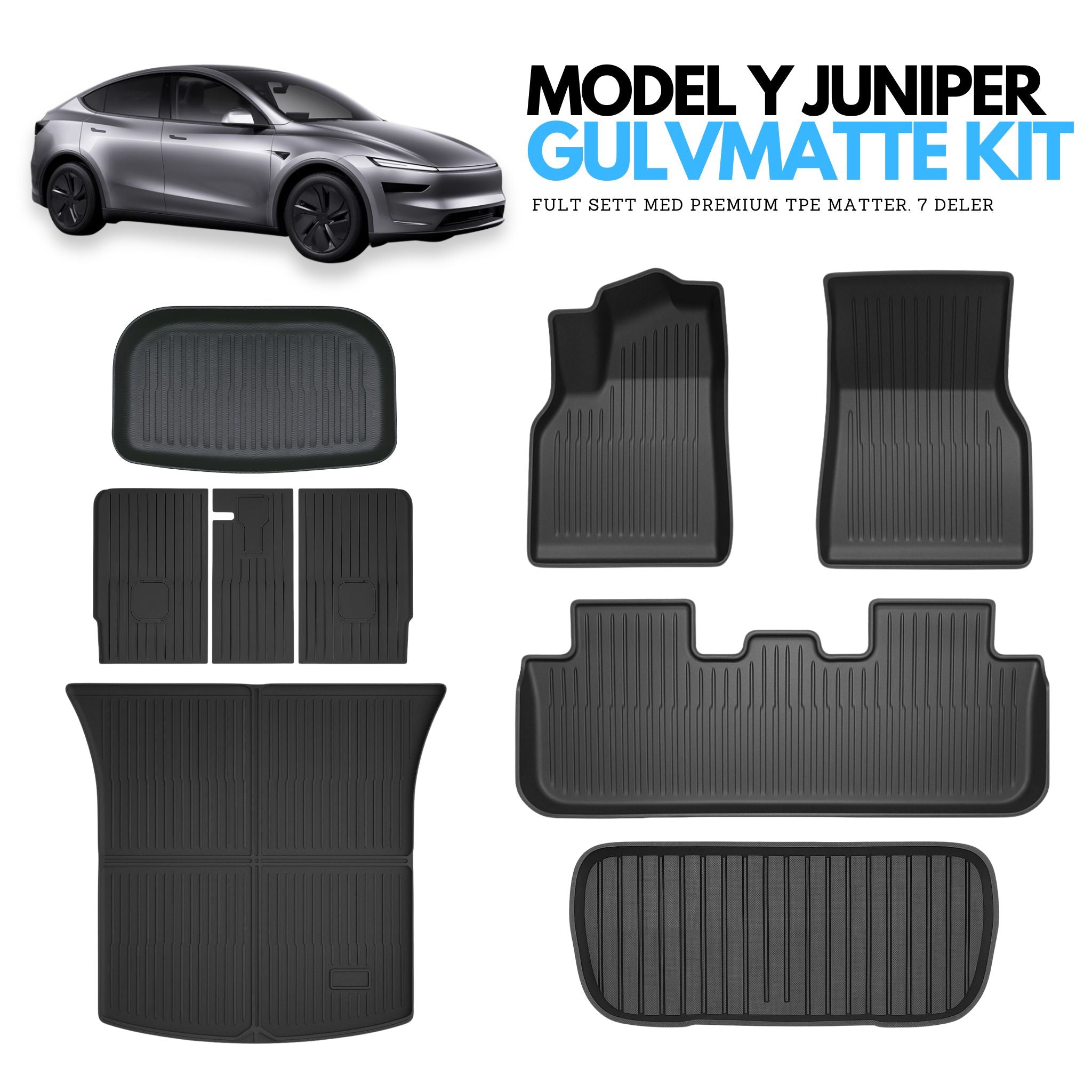 Gulvmatte kit til Tesla Model Y Juniper. Komplett sett med TPO kvalitetsmatter til førerside, passasjerside, baksete, bagasjerom, beskyttelse til bakseter, frunk og trunk. 7 deler totalt.