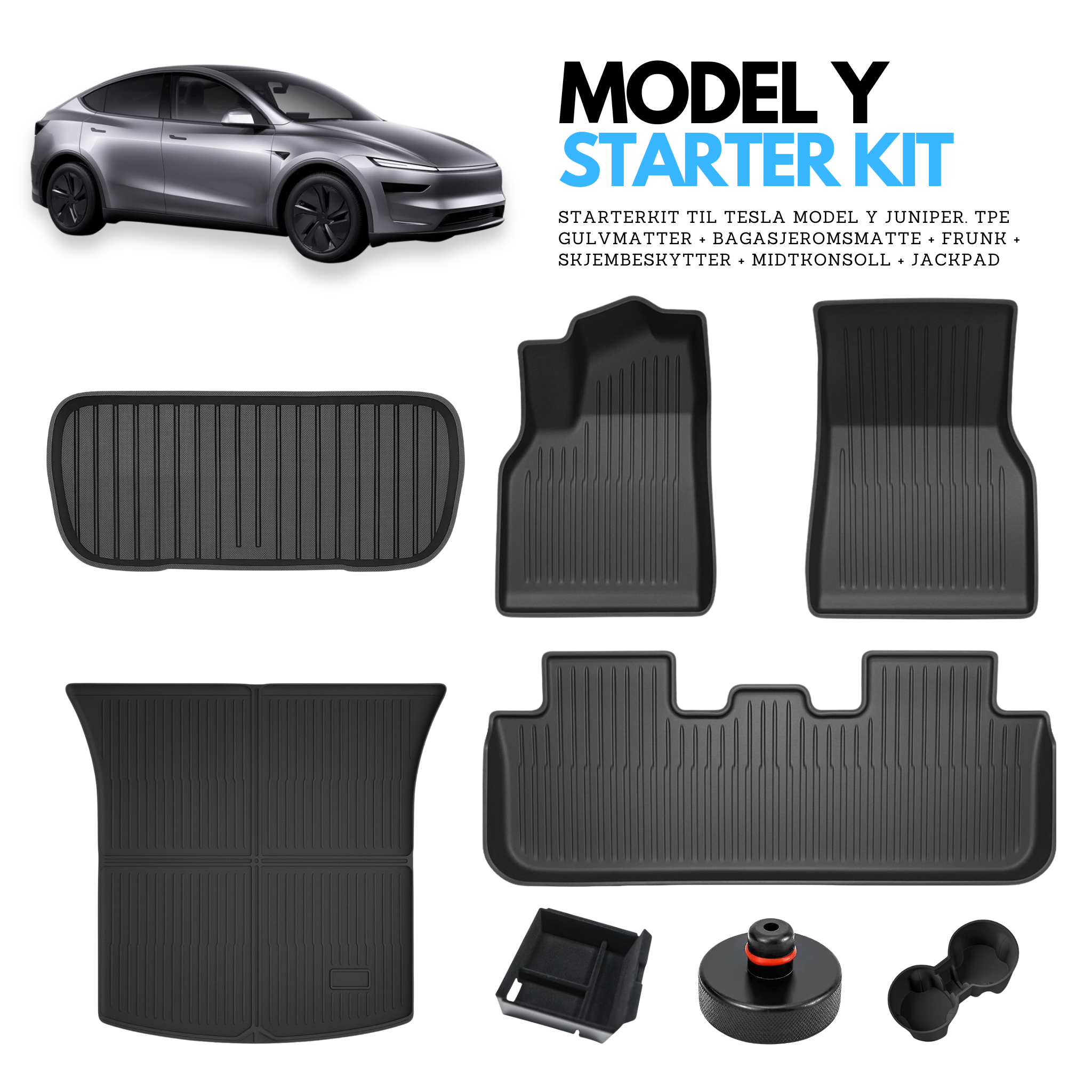 Starter kit til nye Tesla Model Y Juniper 2025. TPE kvalitets gulvmatter til førerside, passasjerside, baksete, bagasjerom og frunk + skjermbeskytter til begge skjermer, midtkonsoll romdeler og jackpad.